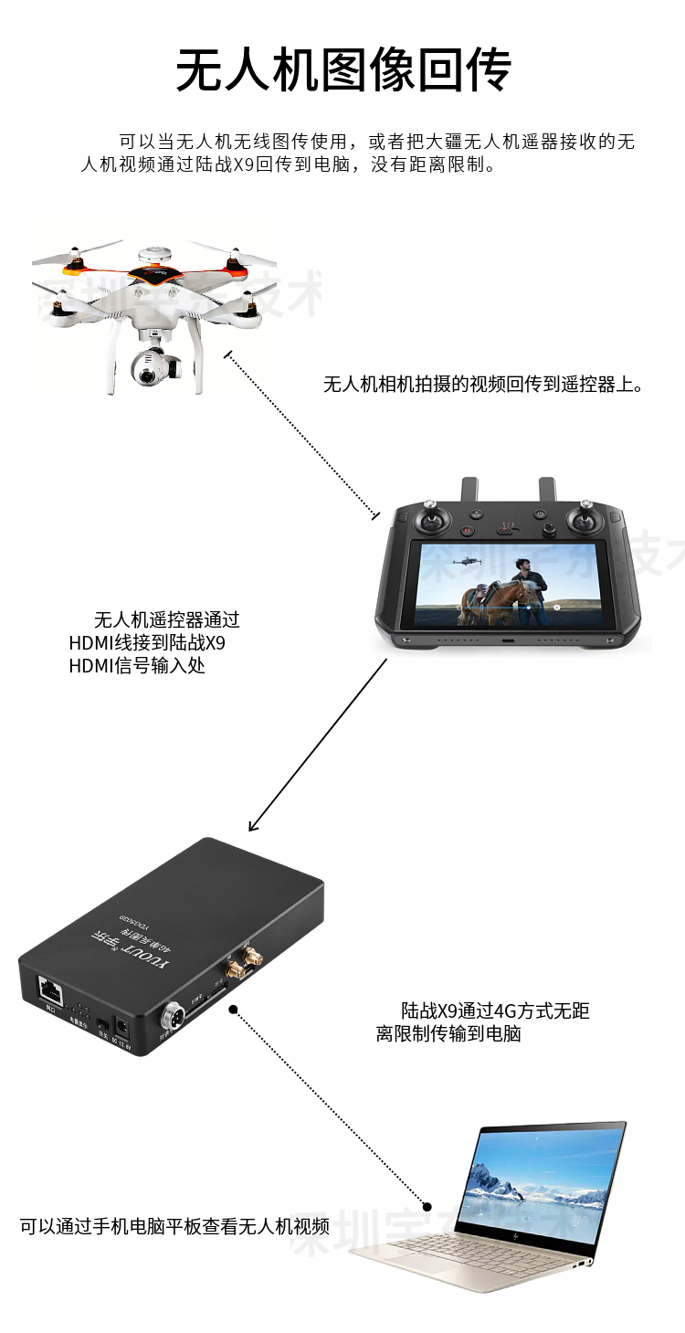 1、把無人機遙控器接收到的無人機空中畫面,通過HDMI線,接到陸戰(zhàn)X9 HDMI輸入接口,可以把空中無人機拍攝的視頻通過4G,沒有距離限制的傳輸到需要監(jiān)看地方。