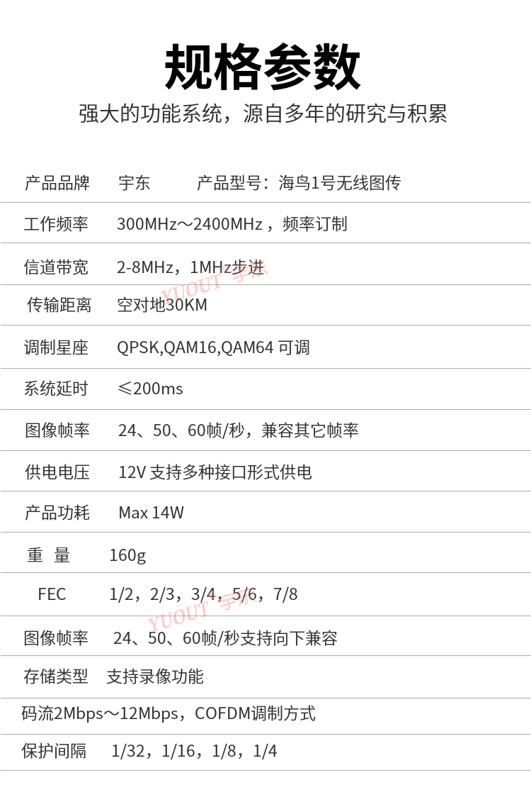 宇東海鳥1號無線圖傳高清微型無線視頻傳輸系統(tǒng),采用Coded Orthogonal Frequency Division Multiplexing:編碼正交頻分復用調制技術,具有傳輸頻帶窄、很強的抗多徑干擾能力和抗多徑衰落能力,能夠實現(xiàn)非視距(NLOS),高速運動情況下實時傳輸高質量圖像。