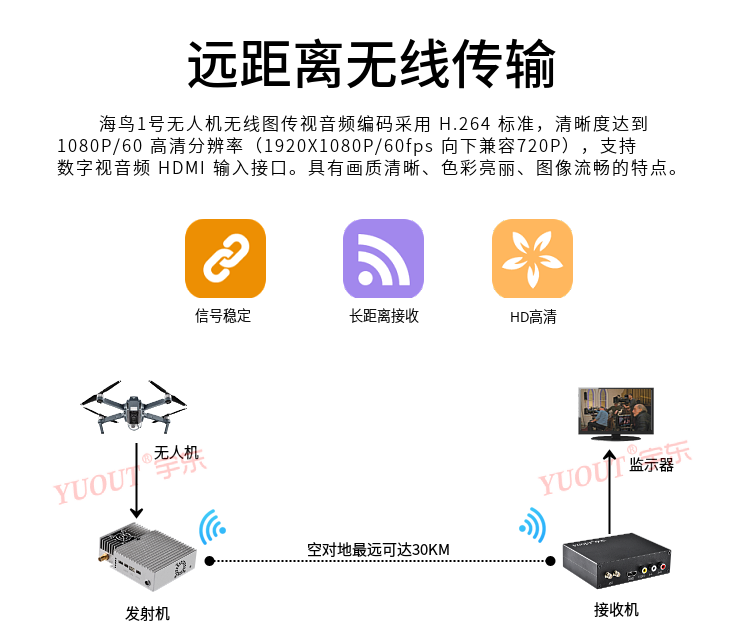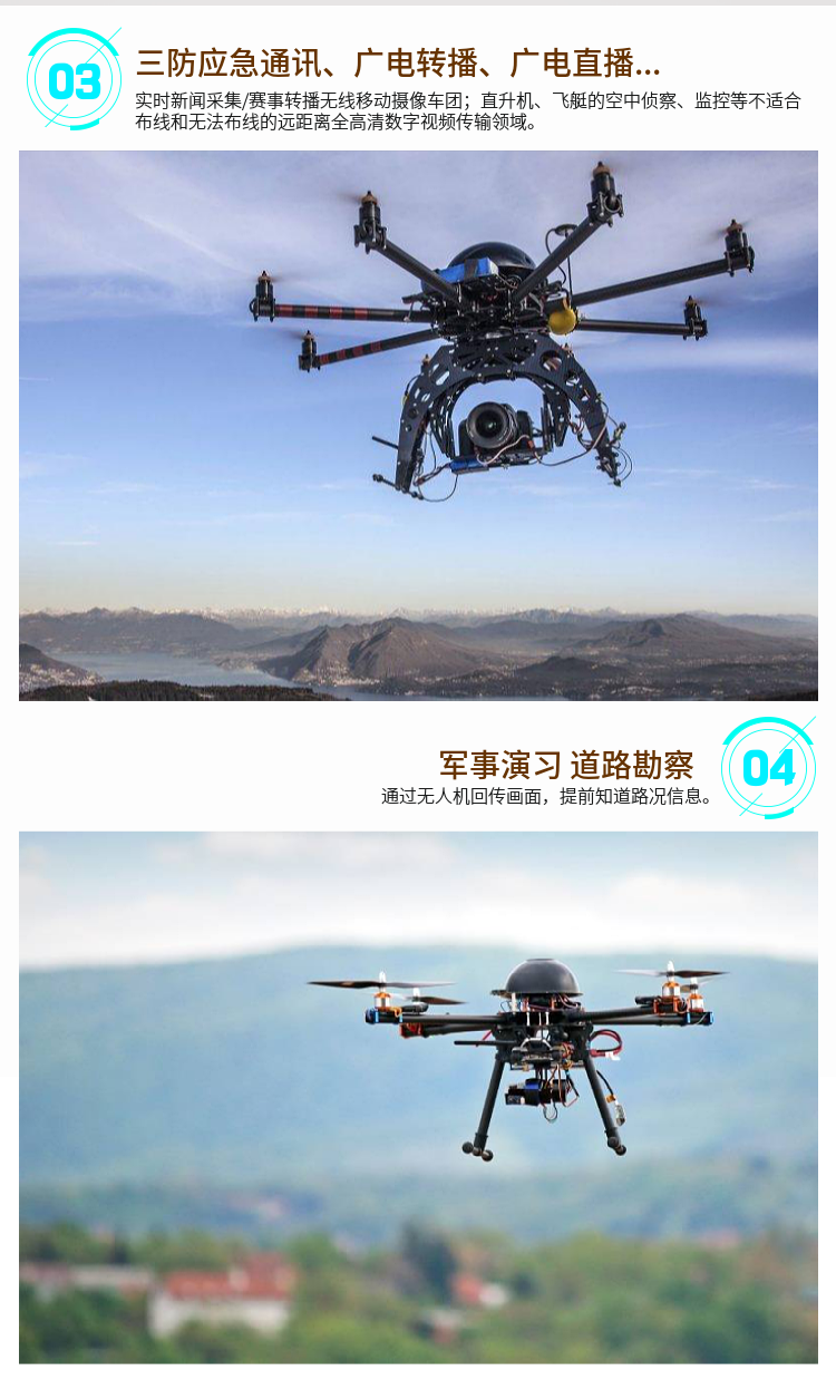 廣泛應用于軍事偵察、邊防巡邏、公安技偵、航拍、空中測繪、電力巡查、鐵路搶險、海事執(zhí)法、城管執(zhí)法、新聞密訪、衛(wèi)生防疫等或突發(fā)事件應急指揮、無人車、無人船、特種機器人等領域。設備體積小可偽裝做密訪取證、空中作業(yè)圖傳、無人機無線圖像傳輸。