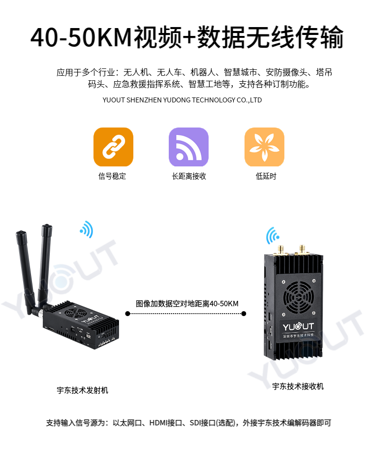 YD-TS0050-WK 是應用于無人機行業(yè)的圖數(shù)控一體化超遠距離無線傳輸設備(最遠可達 40至50 公里),具有體積小、功耗低、通信距離遠等特點,支持高清視頻、飛控數(shù)據、云臺控制數(shù)據、遙控器控制數(shù)據等同時傳輸。