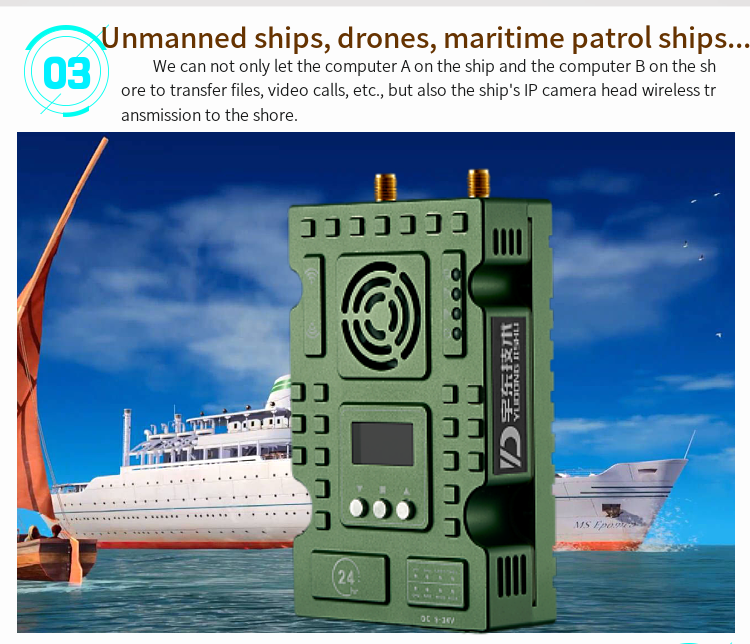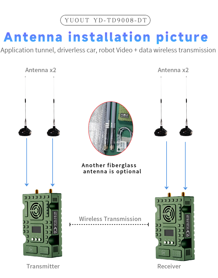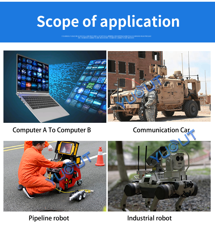 YD-TD9008-DT wireless broadband transmission radio adopts industrial-grade wireless high-speed data transmission technology, non-line-of-sight, non-wifi, set orthogonal frequency division multiplexing TDMA and MIMO multi-input and multiple-output capacity technology, completely based on IP Internet protocol, to achieve full bidirectional transparent channel broadband transmission. Non-visual distance: 300-900 meters; Ground visual distance: 2-18 km. The system is pure hardware connection, plug and play; Innovative LCD integrated design, rich CAN bus, RS-485, TTL level interface, better user perspective experience. The channel supports a maximum of 30Mbps of swallowing and spitting, and can be widely used in industrial automation, industrial robots, drones and other communication work.