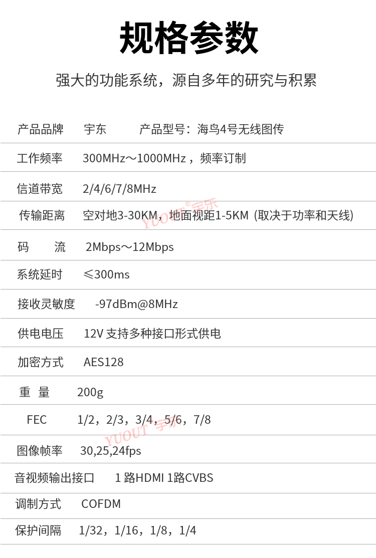 宇東海鳥4號無線圖傳高清微型無線視頻傳輸系統(tǒng),采用Coded Orthogonal Frequency Division Multiplexing:編碼正交頻分復(fù)用調(diào)制技術(shù),具有傳輸頻帶窄、很強(qiáng)的抗多徑干擾能力和抗多徑衰落能力,能夠?qū)崿F(xiàn)非視距(NLOS),高速運(yùn)動情況下實(shí)時傳輸高質(zhì)量圖像。